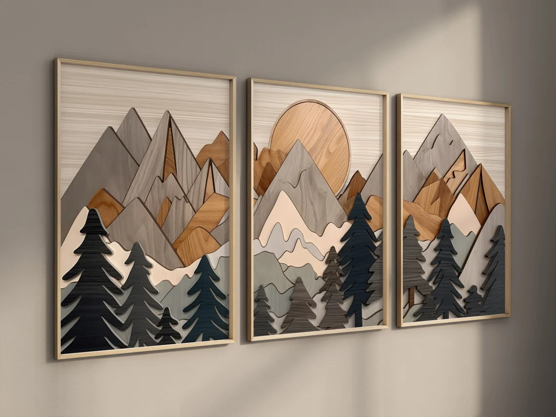 + Free ShippingA beautiful three-panel wooden wall art depicting a stylized mountain range. Crafted from high-quality [MDF] – Different sizes – set of 3